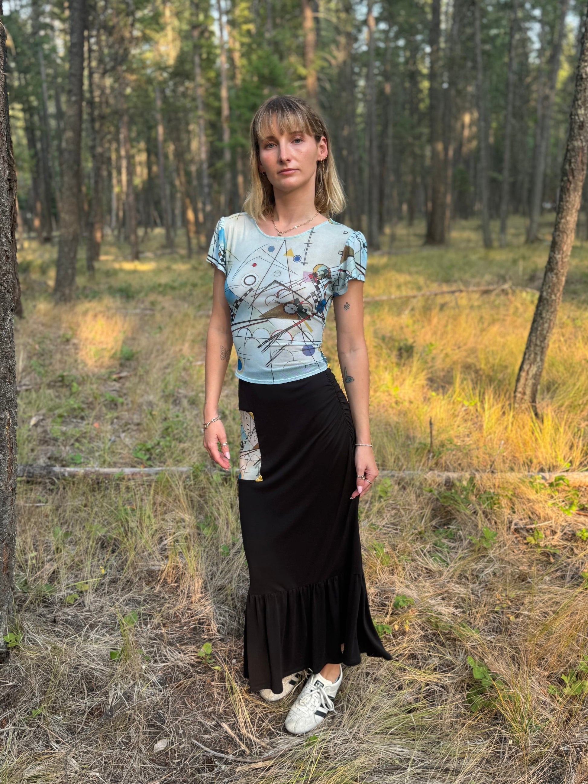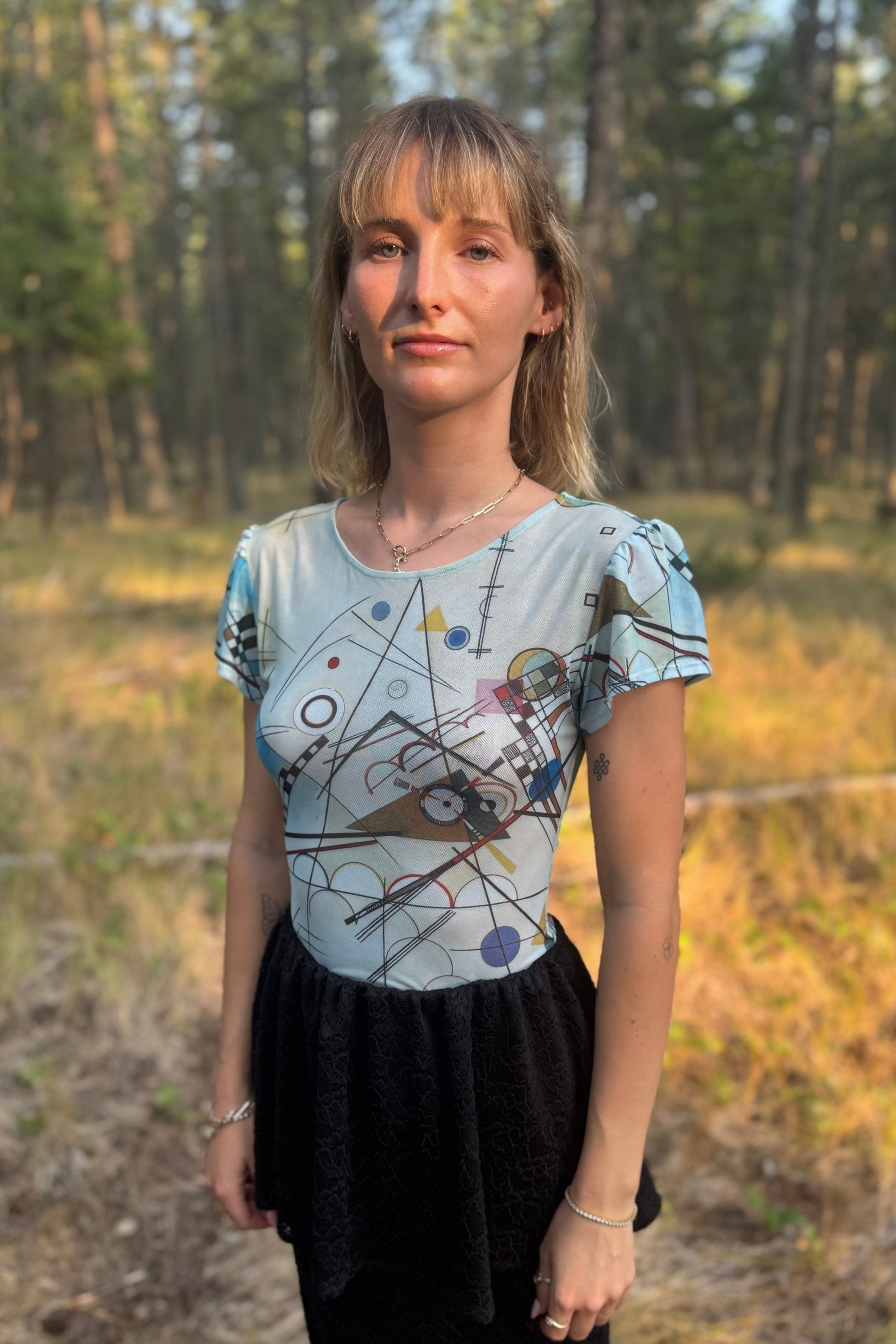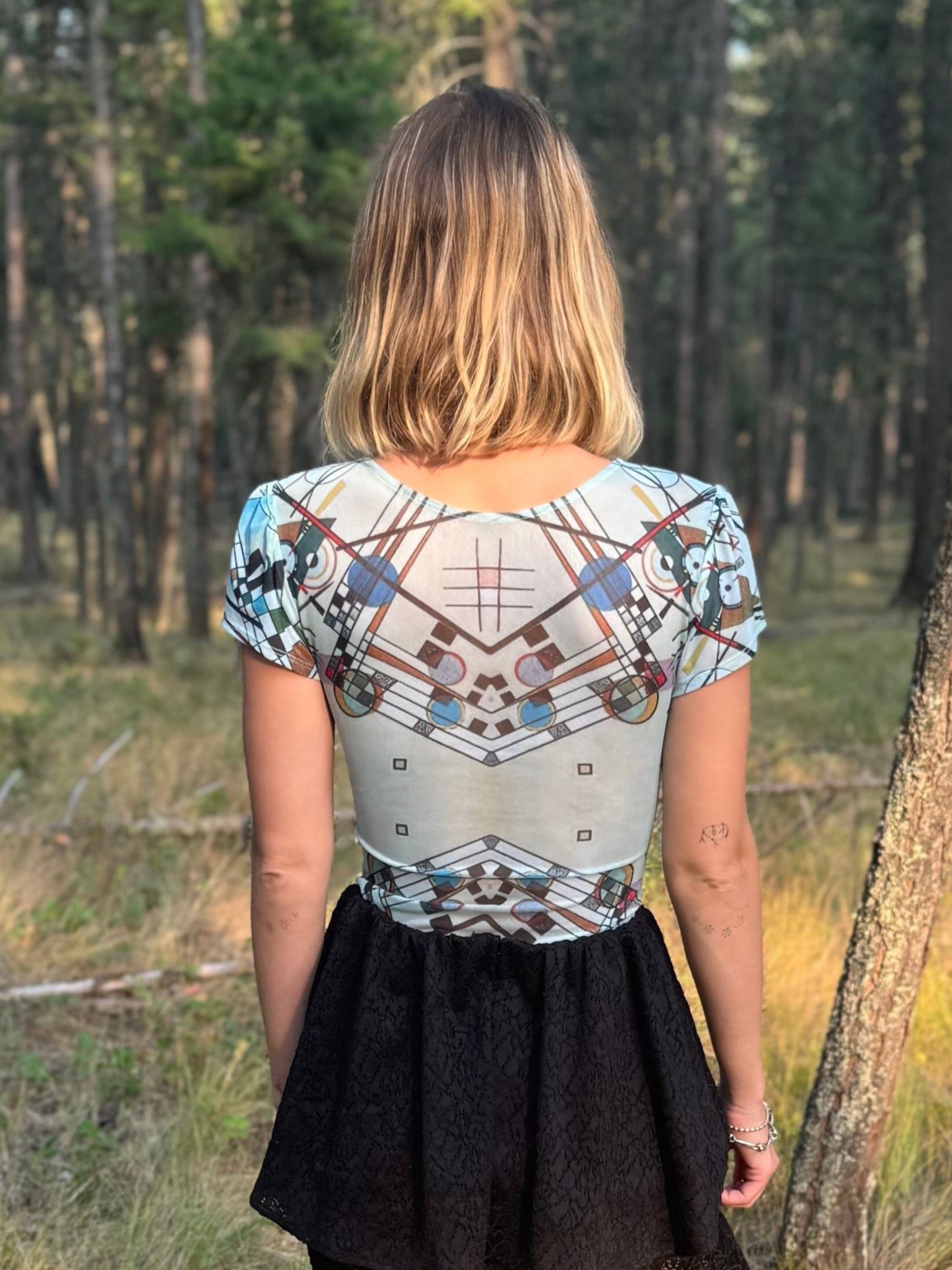 The mesh is transparent and printed with one of our favorite paintings, Vasily Kandinsky's 'Composition 8' - 1923. See it in person at the Guggenheim Museum in New York. The print is placed to flatter the waist at the front and back.