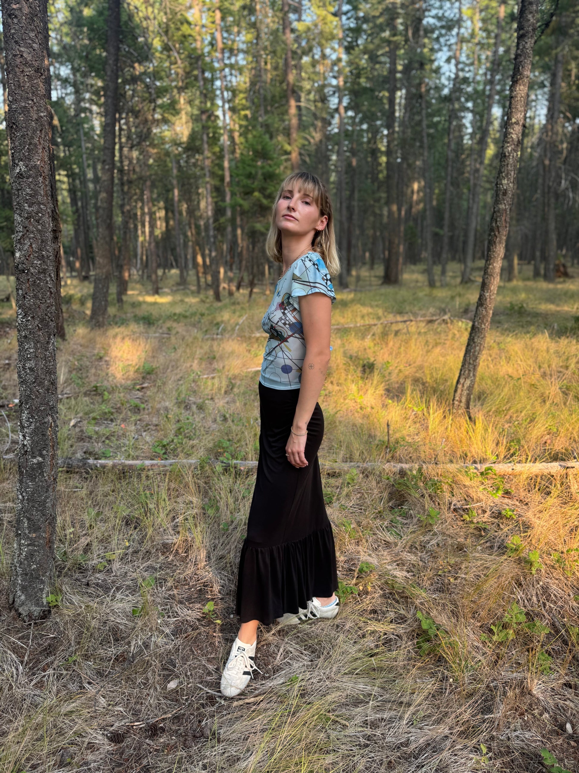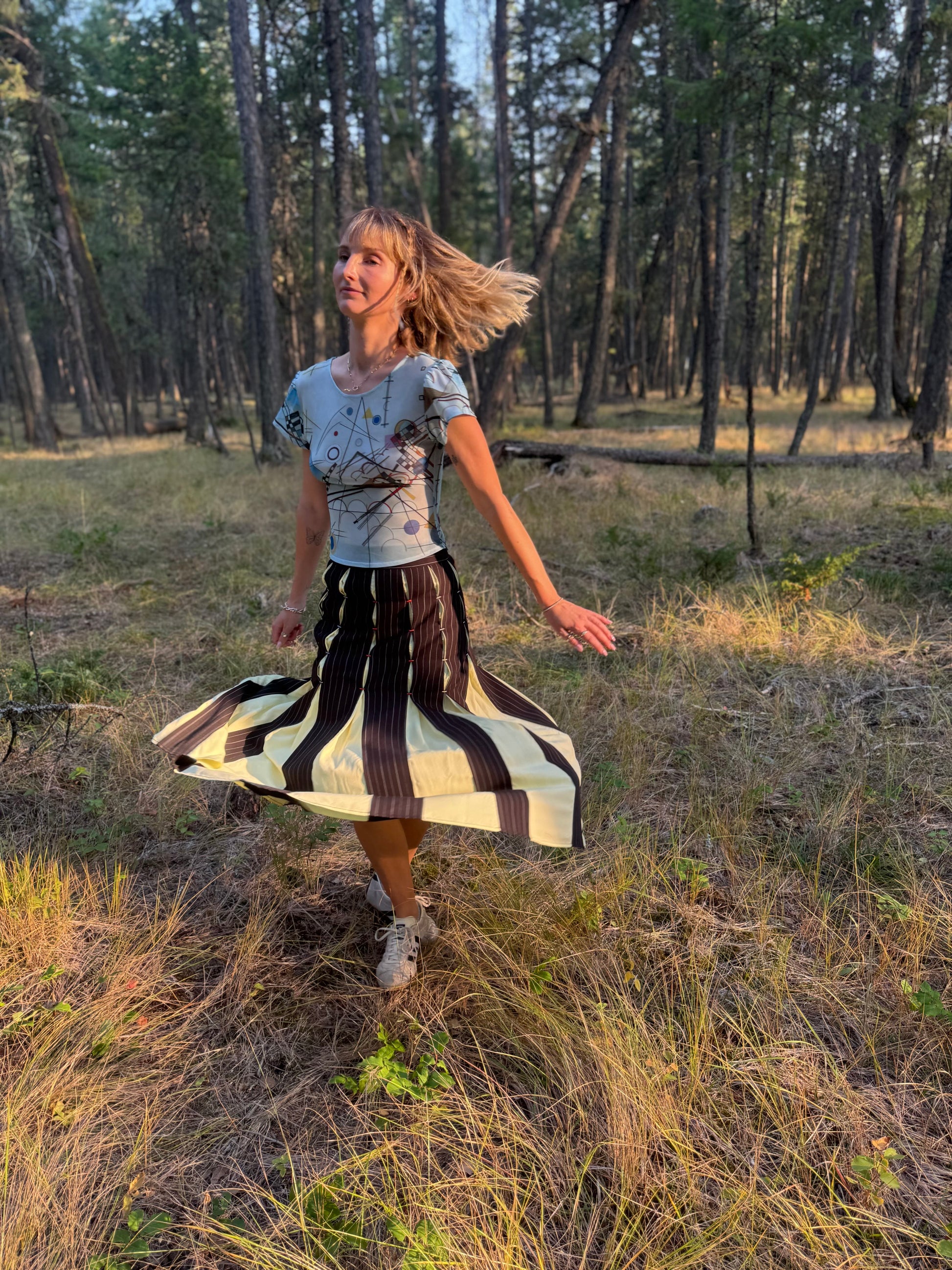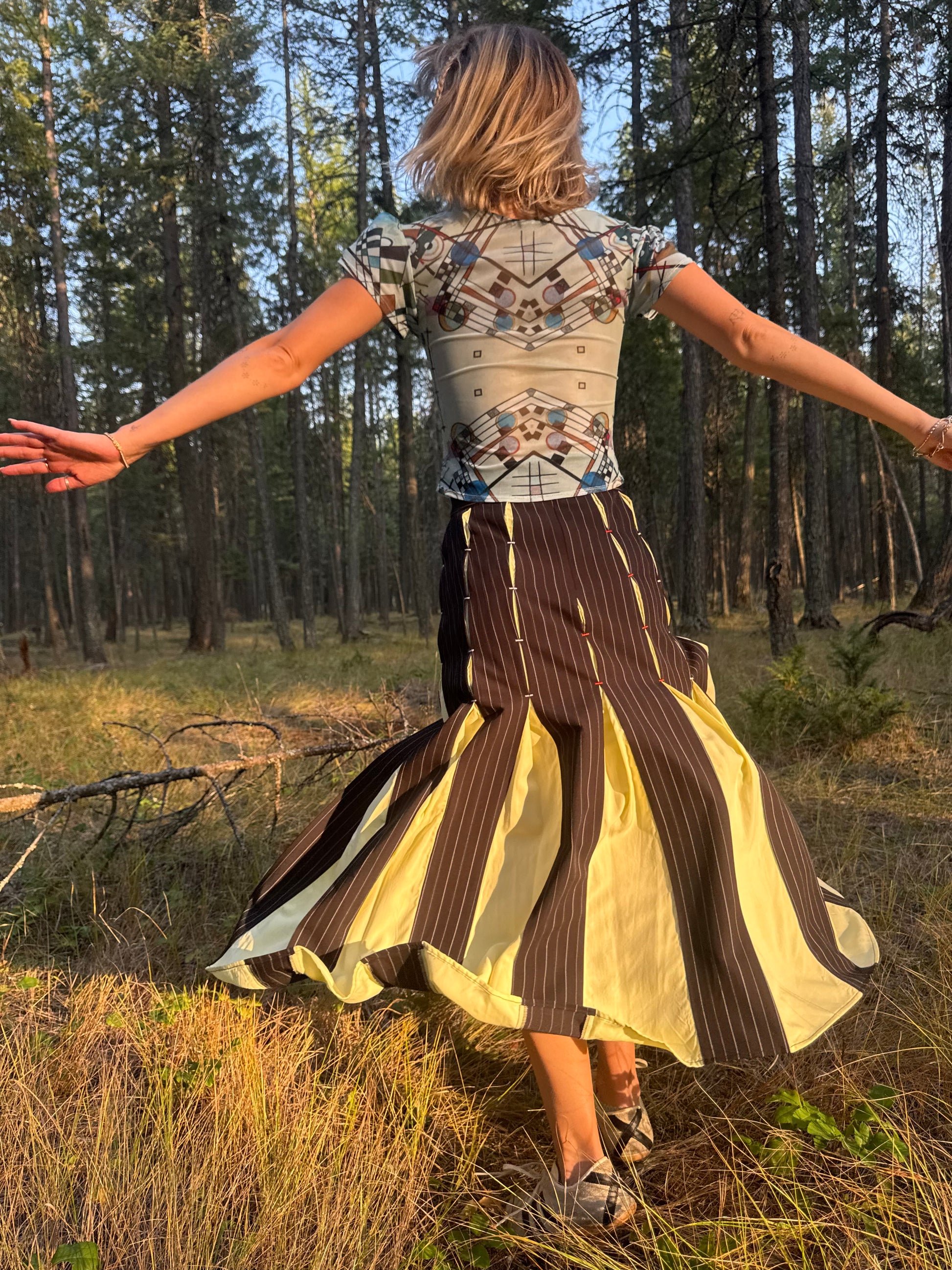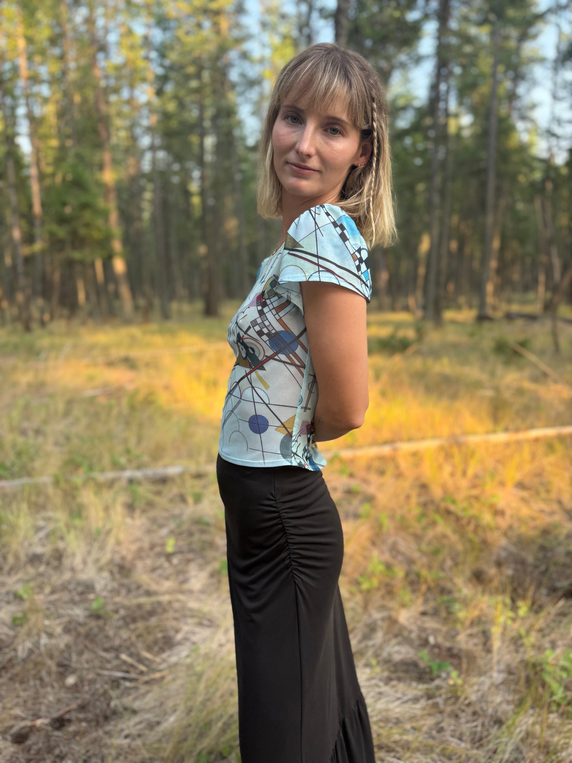 The mesh is transparent and printed with one of our favorite paintings, Vasily Kandinsky's 'Composition 8' - 1923. See it in person at the Guggenheim Museum in New York. The print is placed to flatter the waist at the front and back.